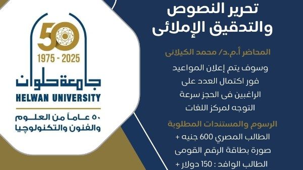 أعلن مركز اللغات للأغراض المتخصصة بكلية الآداب جامعة حلوان عن فتح باب التسجيل في دورة تدريبية جديدة تحت عنوان "تحرير النصوص والتدقيق الإملائي"، يقدمها الدكتور محمد الكيلاني، الخبير المتميز في مجال اللغة العربية وتحرير النصوص.